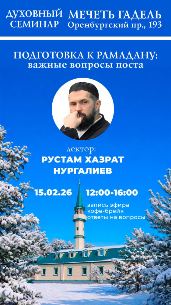 15нче февраль көнне башкалабызның “Гадел” мәчетендә “Рамазанга әзерлек: ураза буенча төп сораулар” дип исемләнгән семинар узачак. Очрашуда Татарстан Мөфтие киңәшчесе, Евразия Ислам советында фәтвалар буенча рәис урынбасары, шәригать фәннәре докторы, фикһ буенча Татарстандагы иң яхшы белгеч Рөстәм хәзрәт Нургалиев чыгыш ясаячак.