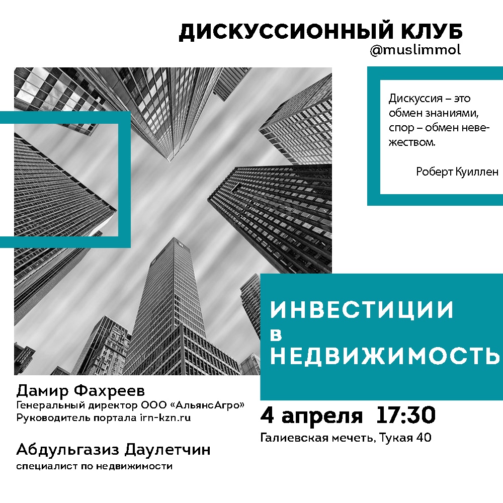 Завтра, 28-го дня месяца Раджаб (4 апреля) в 17.30, в Галиевской мечети Казани состоится очередное заседание мусульманского дискуссионного клуба, которое будет посвящено теме инвестиций в недвижимость. Встреча пройдет в формате круглого стола. В качестве экспертов приглашены генеральный директор организации, которая занимается подготовкой к продаже, покупкой и продажей недвижимого имущества Дамир Фахреев и специалист по недвижимости Абдульгазиз Даулетчин.