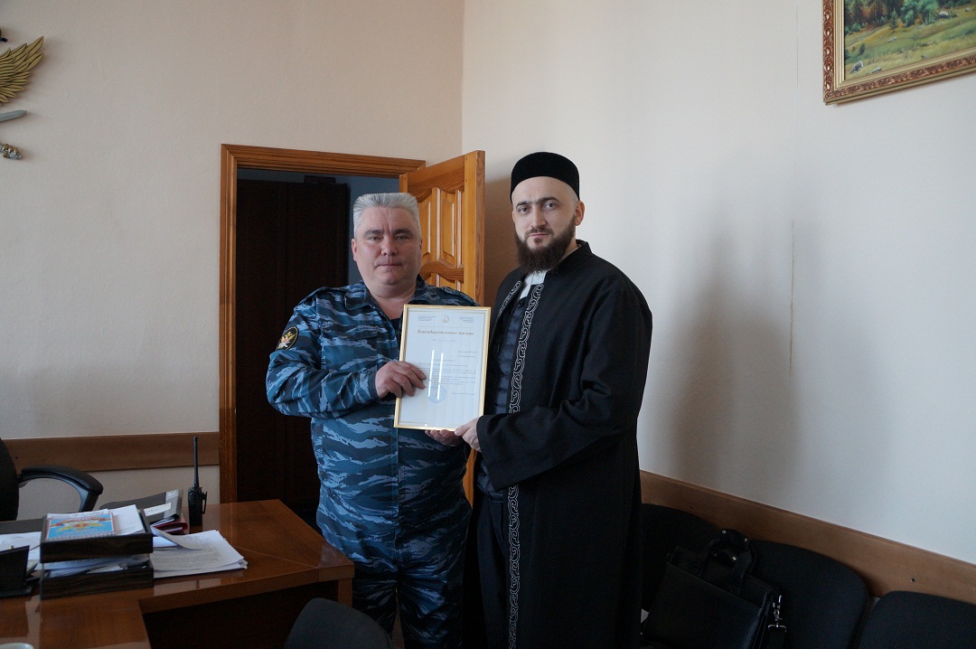 Сегодня, 27-го дня месяца Раджаб, муфтий Татарстана Камиль хазрат Самигуллин совершил рабочую поездку в Зеленодольский район РТ. В рамках поездки он посетил исправительную колонию № 5 в селе Нижние Вязовые. Сначала муфтий провел рабочую встречу с начальником колонии – подполковником внутренней службы Сергеем Емельяновым. Во встрече также приняли участие советник муфтия по социальным вопросам Ильдар хазрат Баязитов и президент фонда «Ярдэм» Ильгам Исмагилов. В ходе беседы были достигнуты договоренности о содействии в проведении ифтаров и проповедей о посте в благословенный месяц Рамадан для практикующих мусульман, отбывающих наказание. Кроме того, Камиль хазрат Самигуллин вручил Сергею Емельянову и его заместителю Альберту Загфарову Благодарственное письмо ДУМ РТ за плодотворное сотрудничество и оказание посильной помощи мусульманской умме.