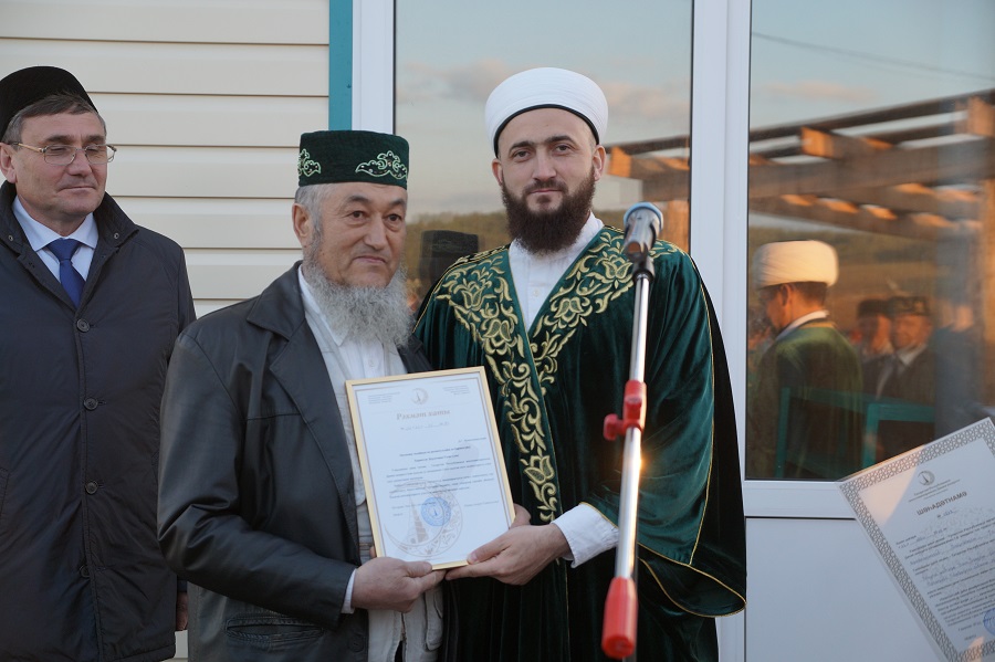 В заключение Камиль хазрат вручил благодарственное письмо за проявленные старания при возведении новой мечети в селе Потапово – Даулятджану Ярмухамметову. Ему же он доверил ею управлять – на глазах у односельчан Даулятджан абый получил из рук муфтия Шахадатнамэ – Свидетельство на право осуществлять религиозную деятельность в качестве имама мечети «Нур».