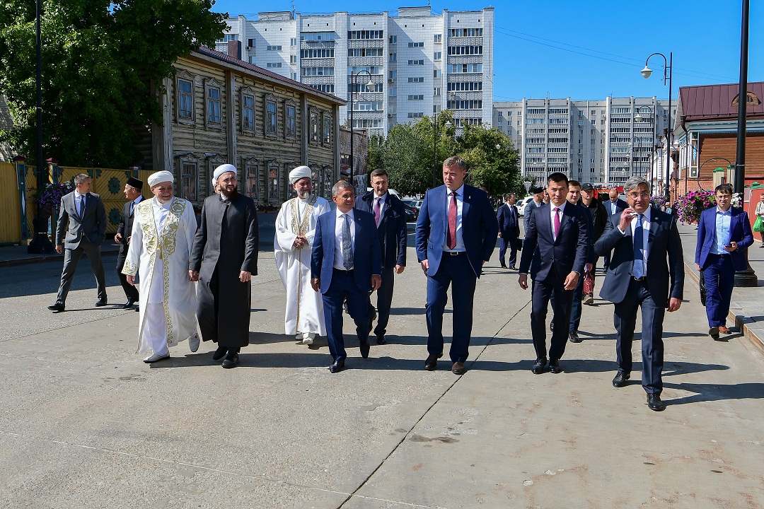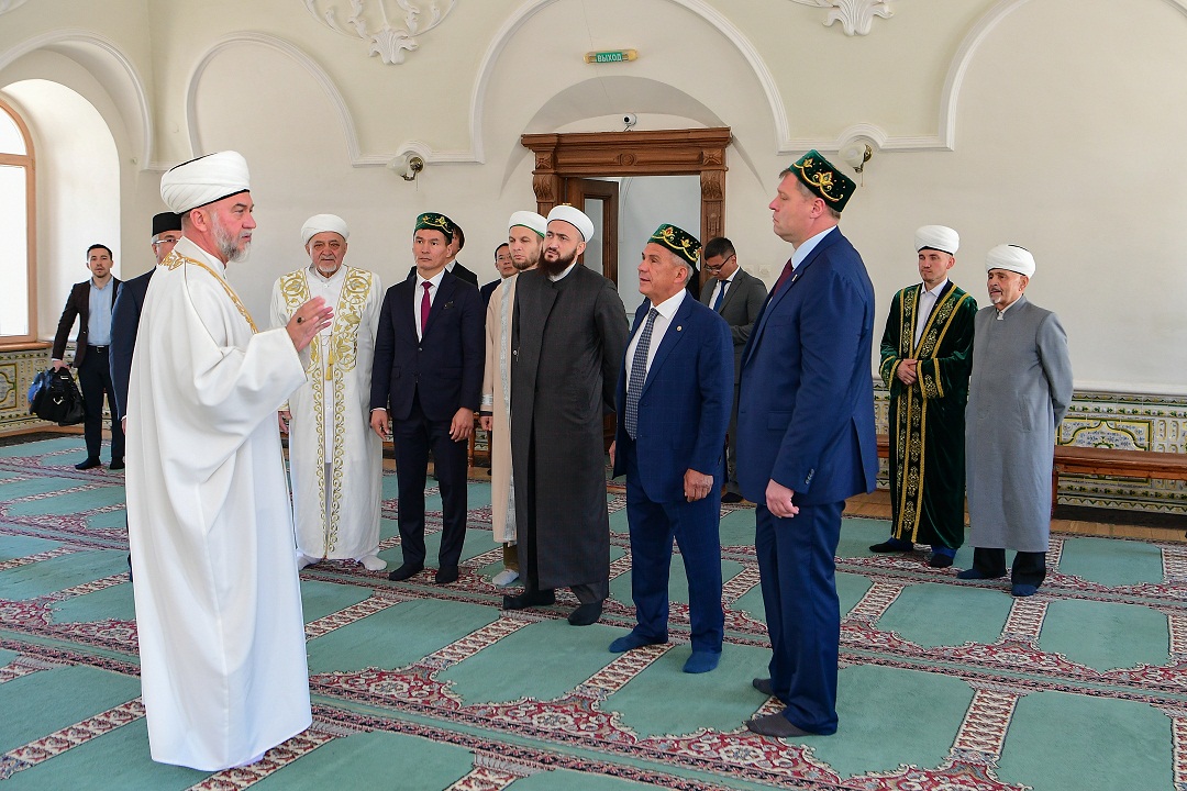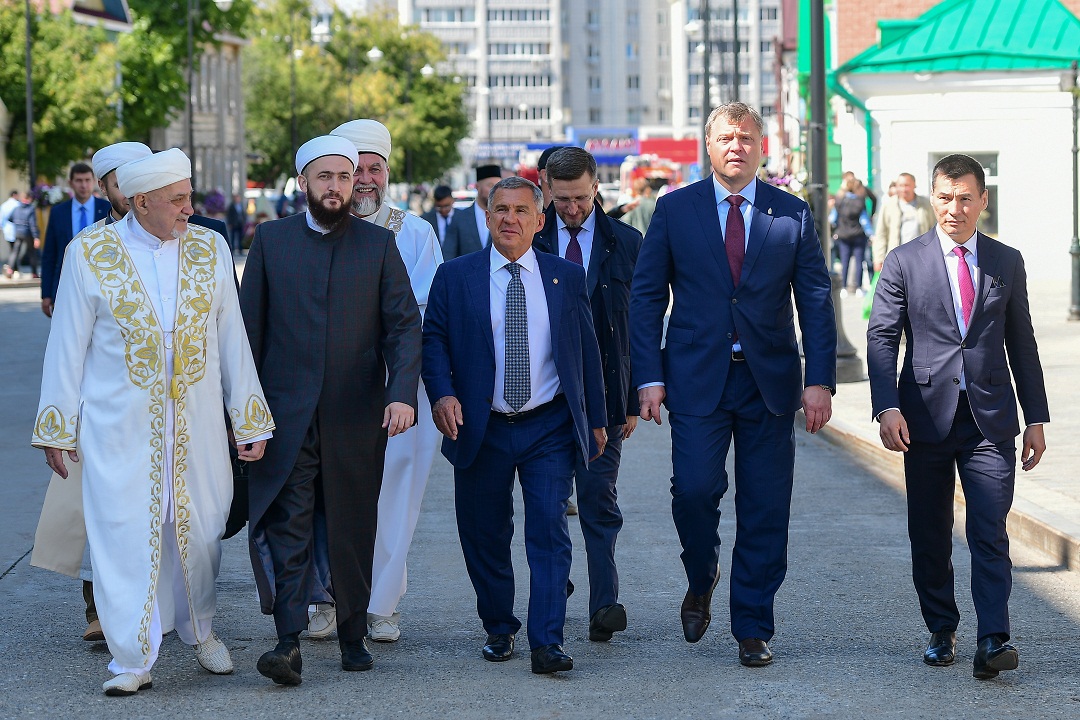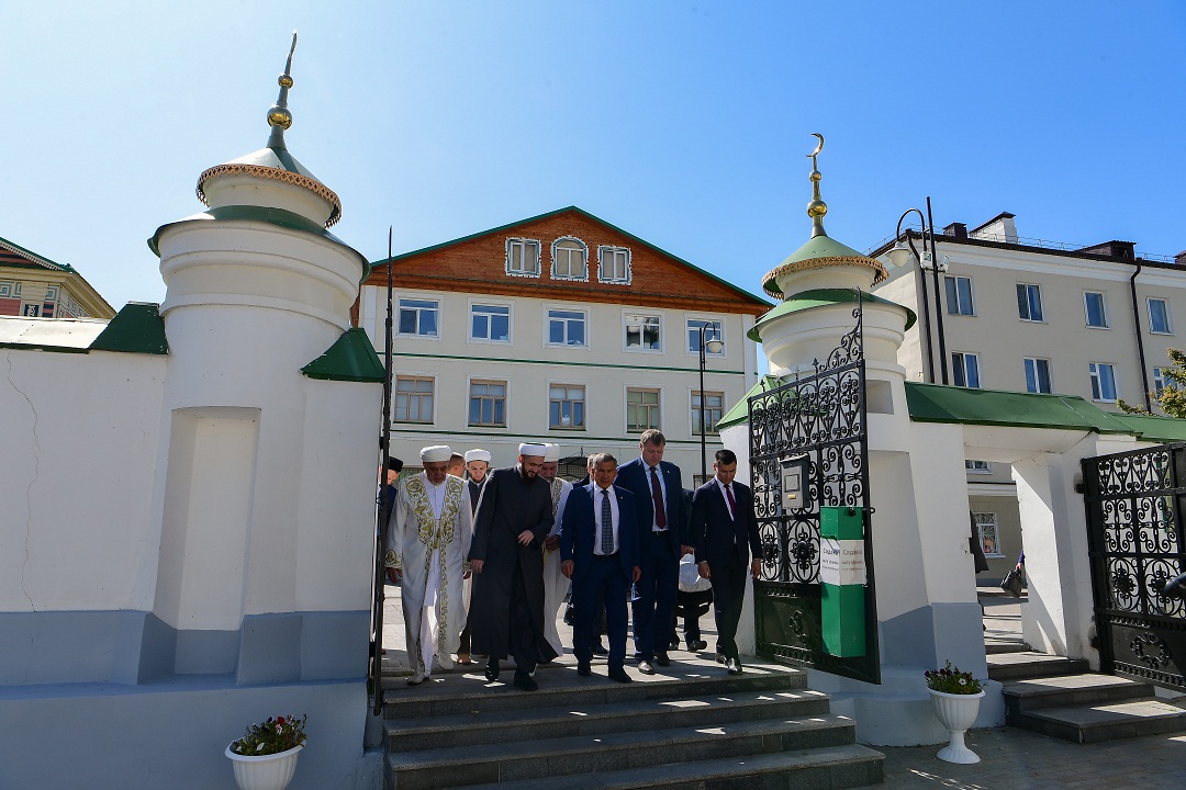 После осмотра мечети Рустам Минниханов, Игорь Бабушкин и Бату Хасиков приняли участие в торжественном маджлисе по случаю праздника Курбан-Байрам, организованном Советом Аксакалов ДУМ РТ.