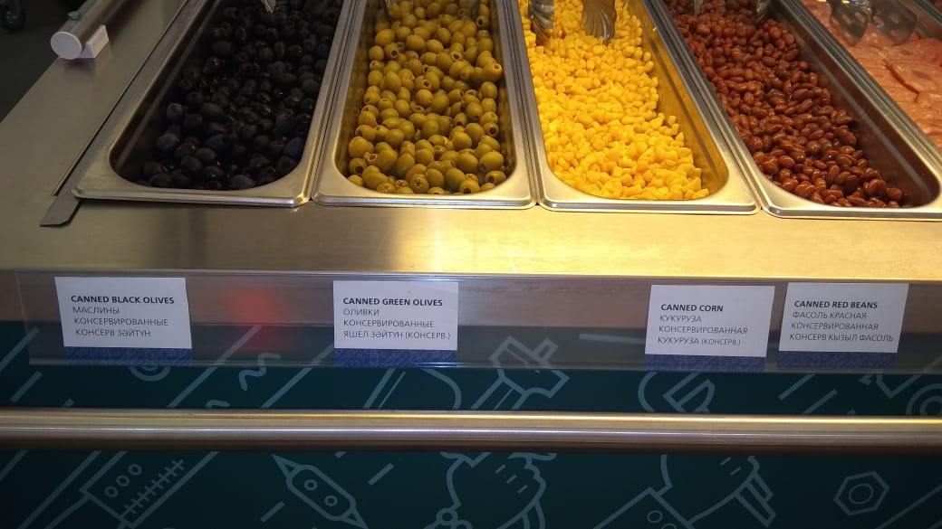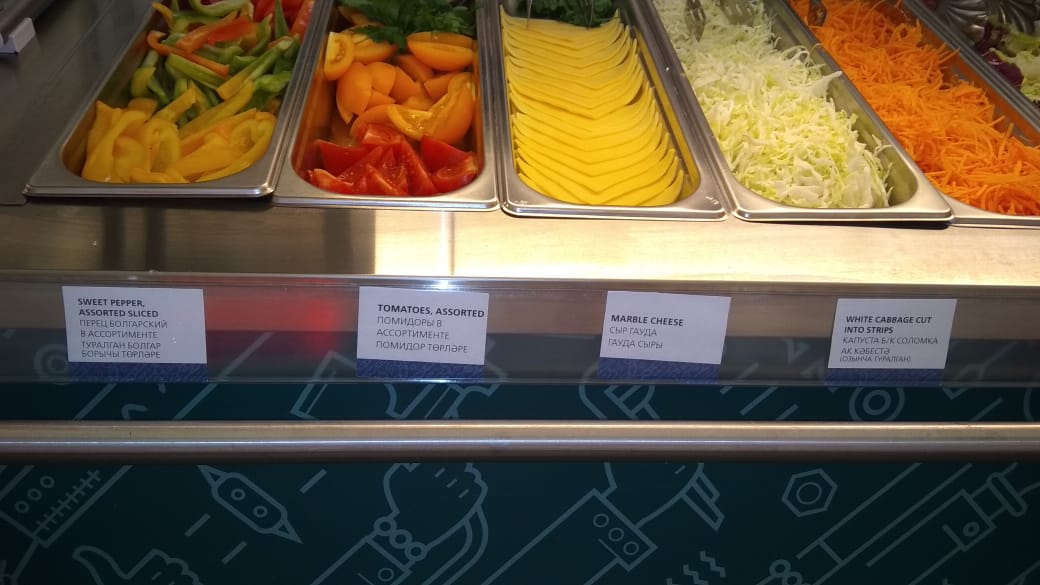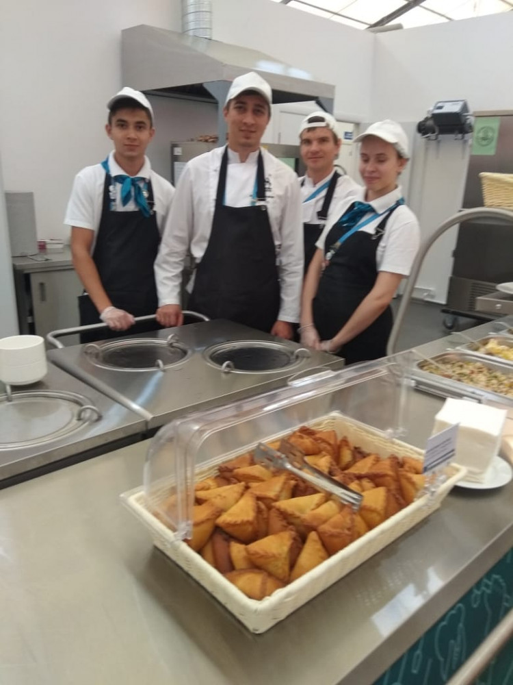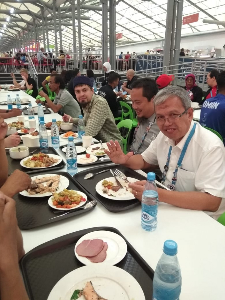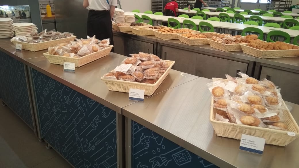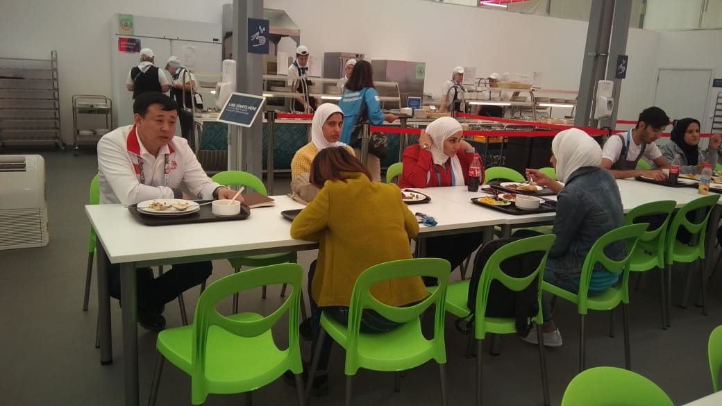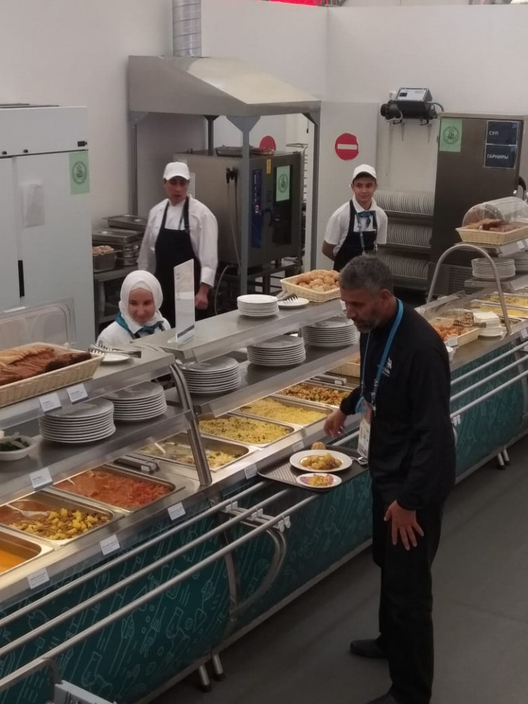 Питание в зоне организуется два раза в день: обед в 11.00-15.00 и ужин в 17.00-22.00 часов. Для участников соревнований подаются блюда европейской, восточной и татарской кухонь. В состав меню, который обновляется в каждый прием пищи, включены первые и вторые блюда и гарниры, салат-бар, выпечка, свежие овощи и фрукты. Постоянными посетителями халяльного общепита на WorldSkills являются участники из Малайзии, Индонезии, ОАЭ, Саудовской Аравии, Иордании и Турции, Ирана.