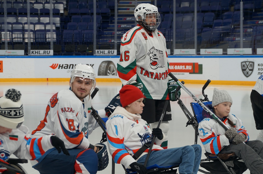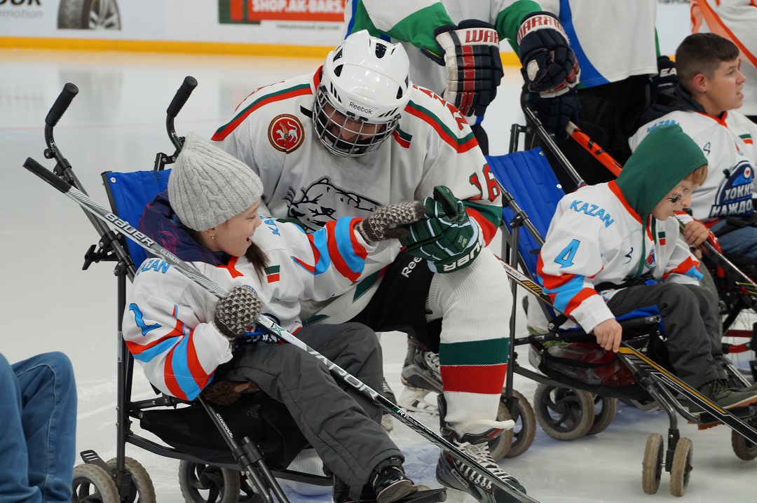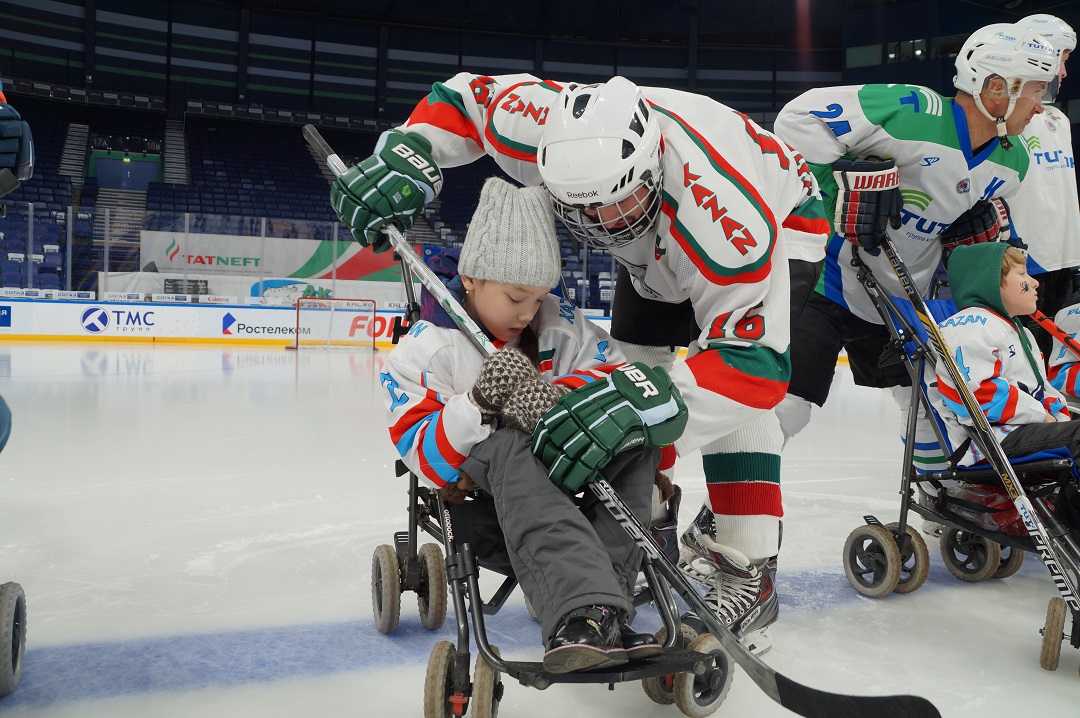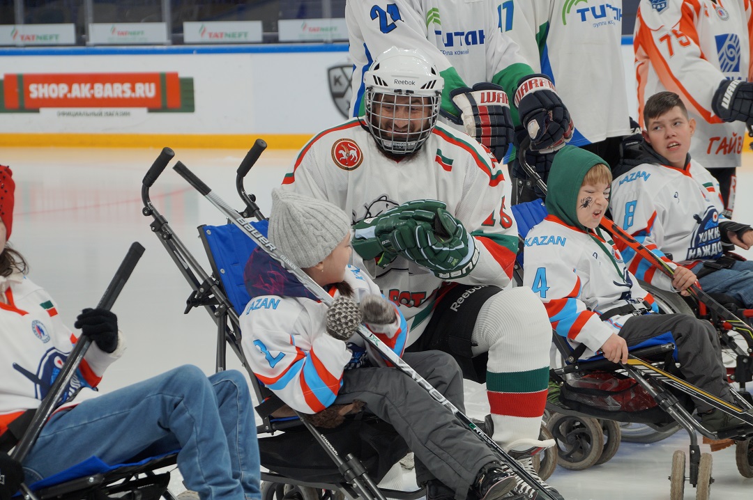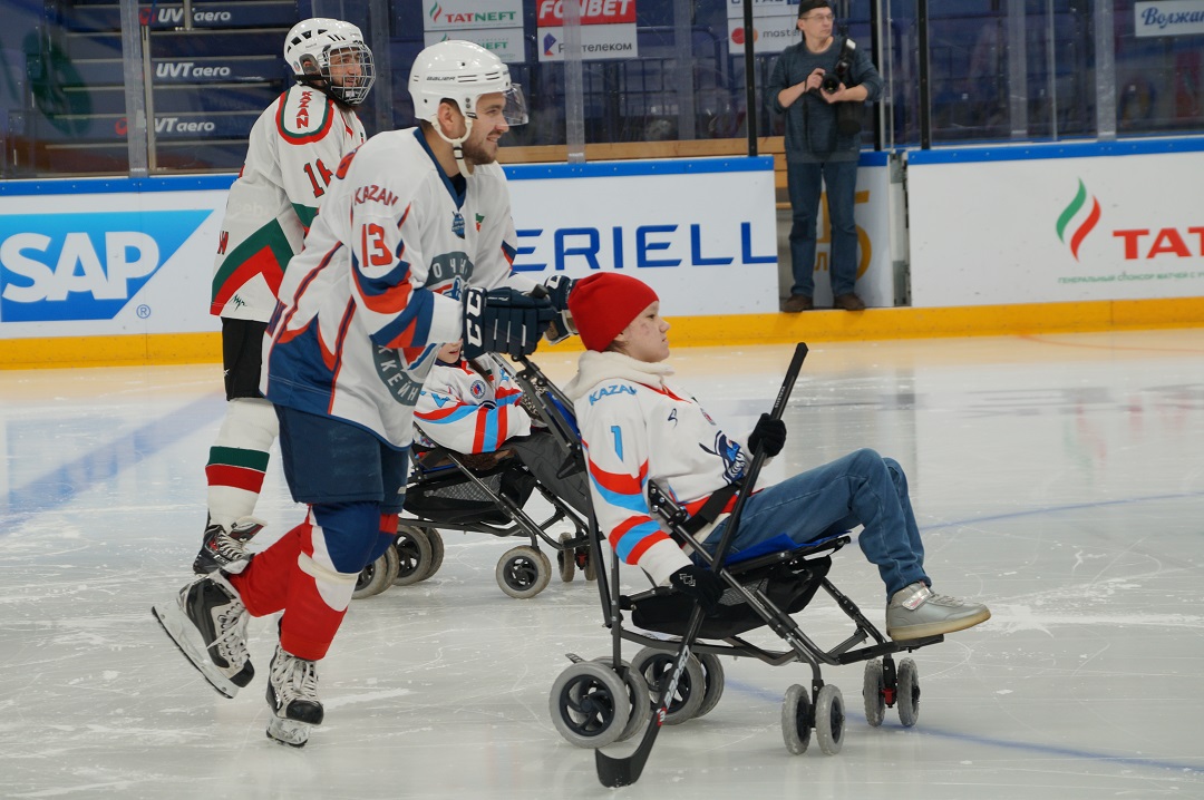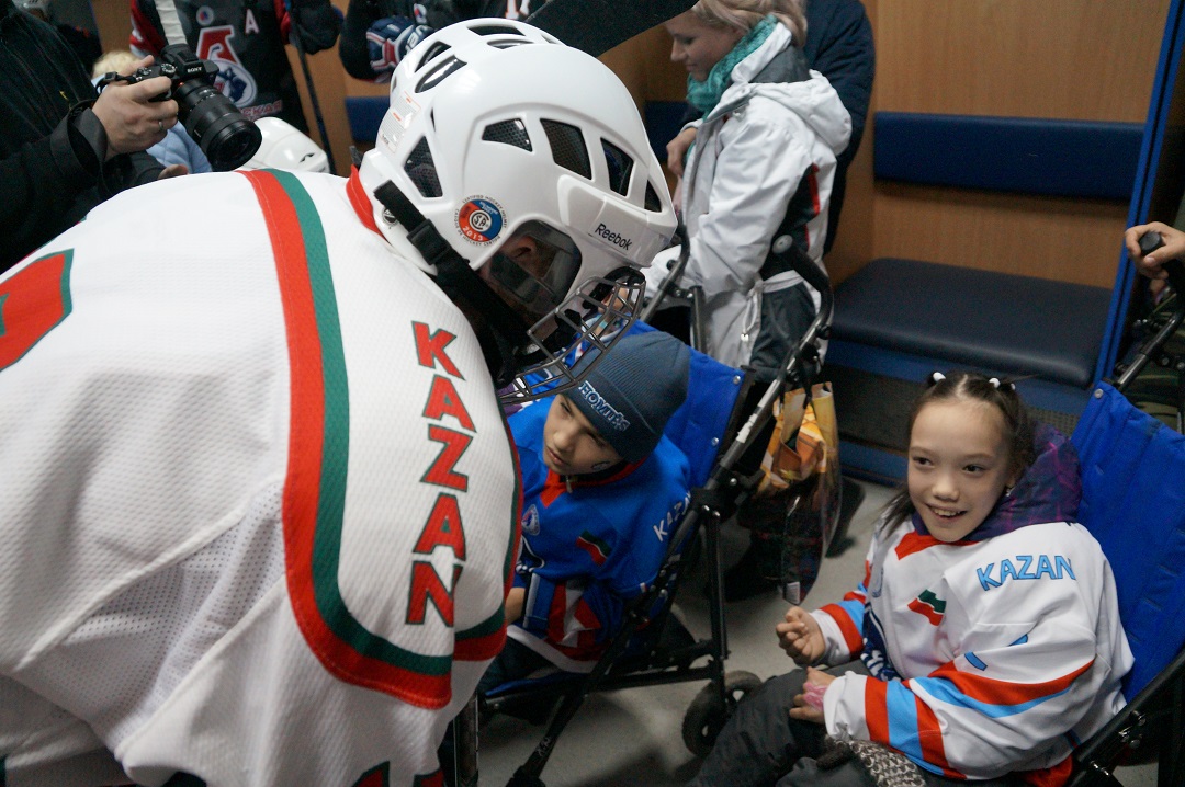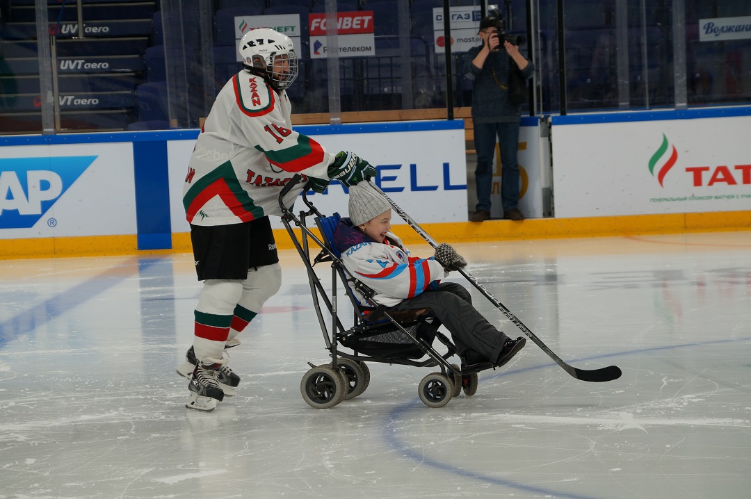 Сегодня, в Казани прошел благотворительный матч «Хоккей каждому» для детей с нарушениями опорно-двигательного аппарата. Матч был организован "Татнефть Арене" Ночной Хоккейной Лигой, Фондом "День добрых дел" и компанией "Даже если" в третий раз между двумя командами «Метеор» и «Торнадо». Каждого юного игрока на льду сопровождал "штурман", который и отвечал за его передвижение. В качестве штурманов играли хоккеисты «Ак Барса» – Владимир Ткачёв и Альберт Яруллин, а также игроки Ночной хоккейной лиги. В благотворительном матче принял участие также муфтий Камиль хазрат Самигуллин, легенда советского хоккея Александр Якушев, генеральный директор Ночной хоккейной лиги Игорь Бахмутов и др. Родители поддерживали своих детишек со скамеек запасных.