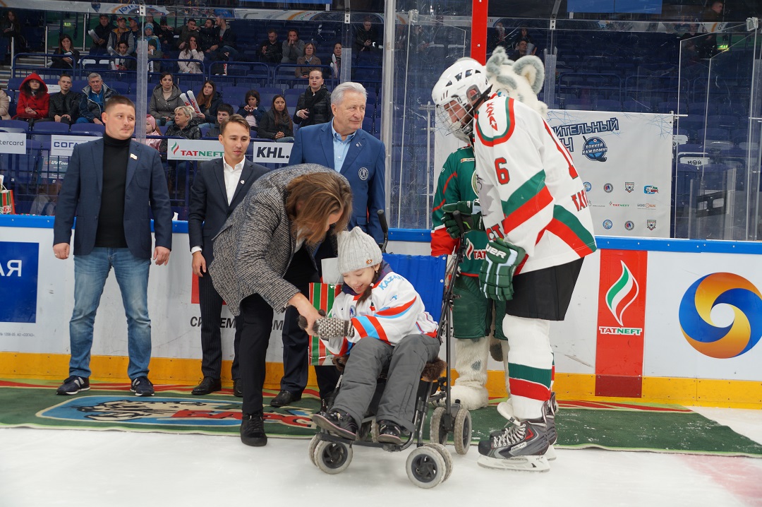 Камиль хазрат сыграл в "добрый" хоккей в паре с Мадиной Зайнуллиной - подопечной Благотворительного фонда "Закят" ДУМ РТ, который в 2016 и в 2018 году оказал ей помощь в оплате реабилитационного курса. У девочки - ДЦП.