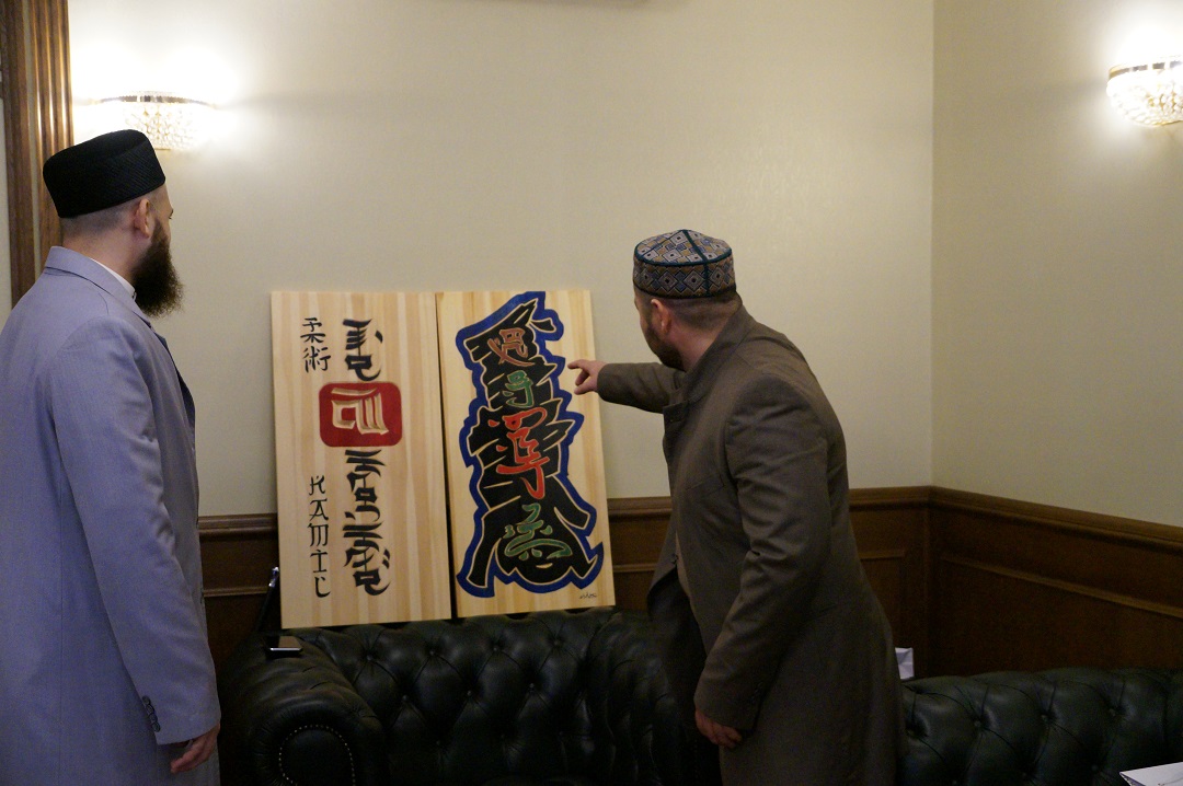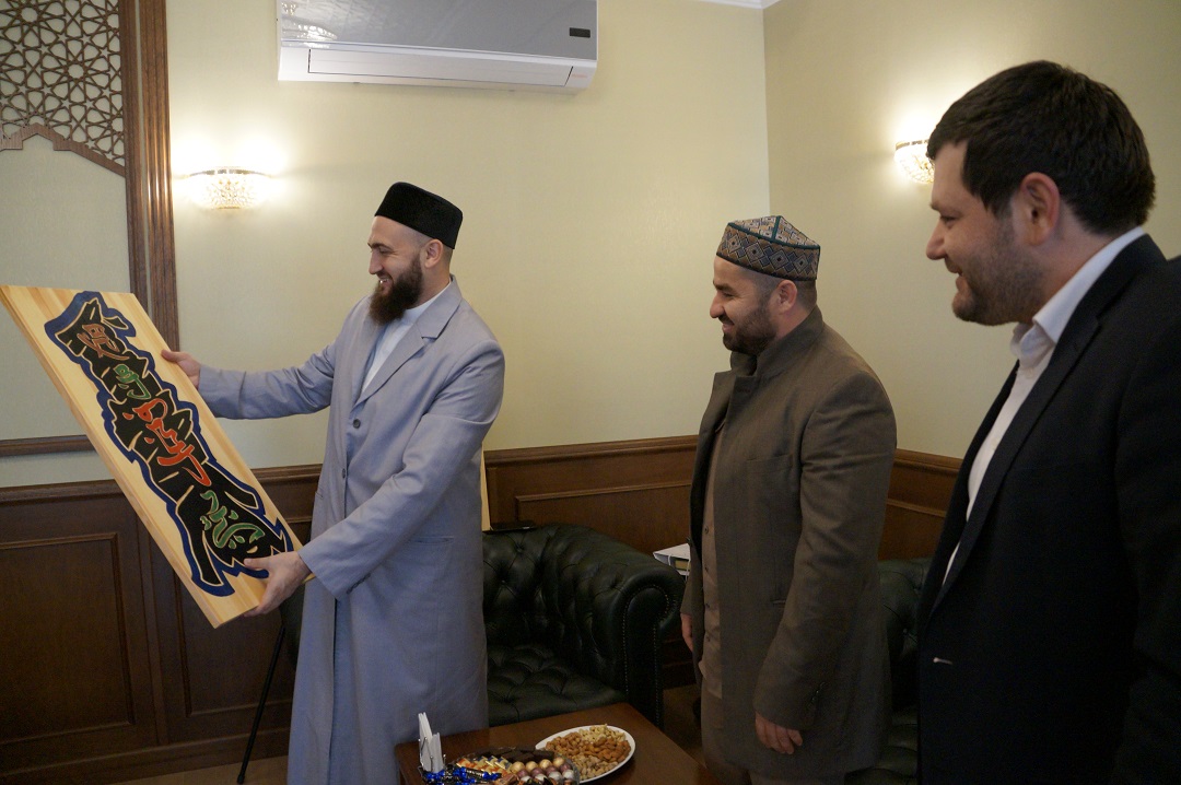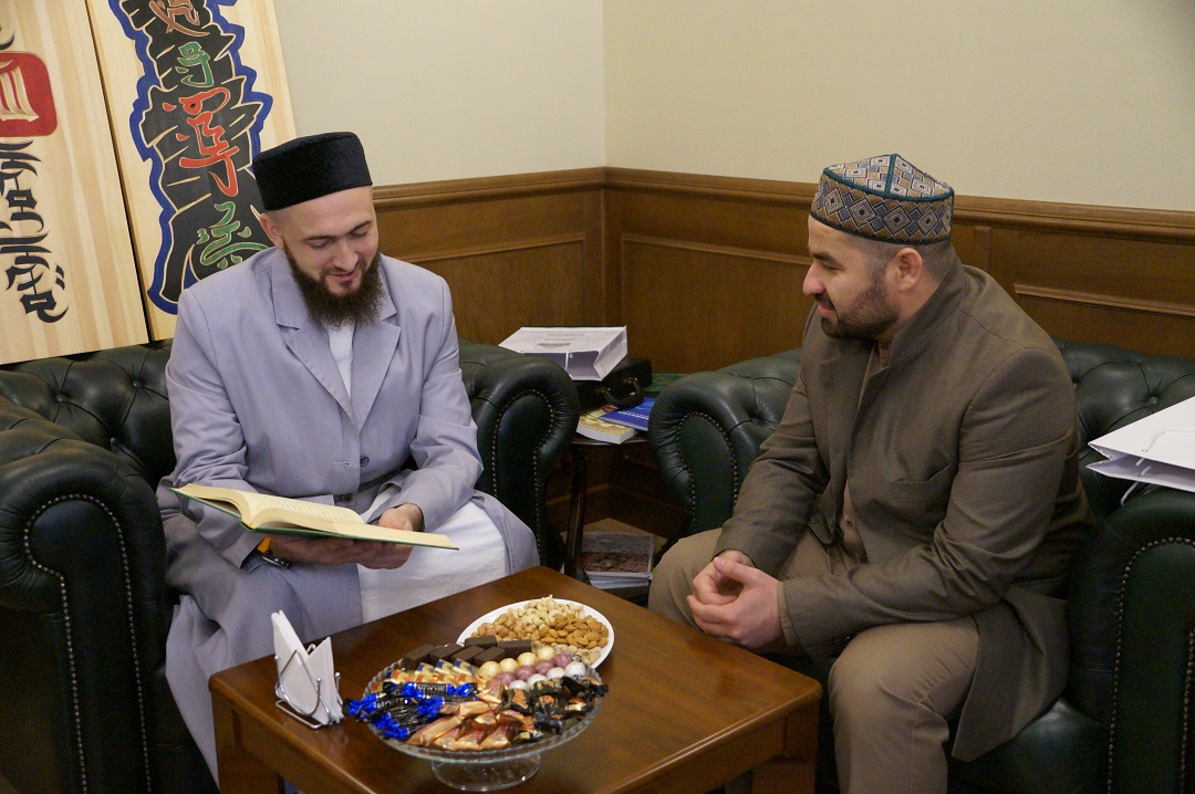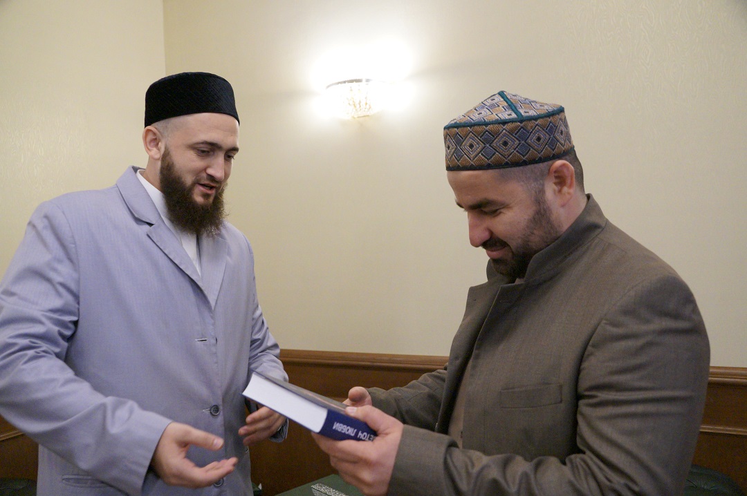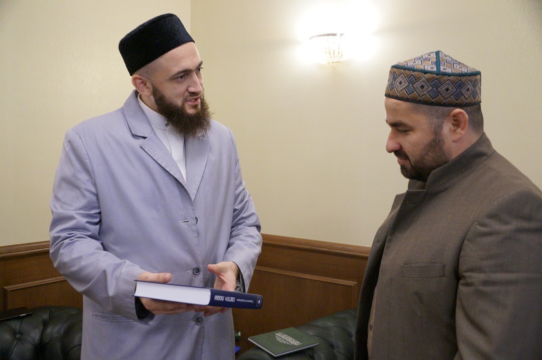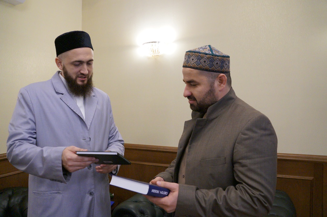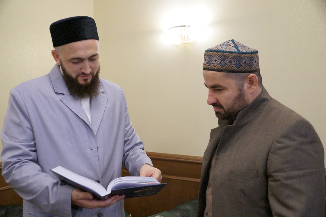 Сегодня, в 5-й день месяца сафар, глава мусульман Татарстана Камиль хазрат Самигуллин встретился с первым заместителем муфтия Республики Дагестан Абдуллой Аджимоллаевым. С самого начала встречи Абдулла хаджи передал Камилю хазрату слова приветствия от имени муфтия Дагестана, шейха Ахмада афанди Абдуллаева и подарил памятный презент от дагестанской диаспоры в Татарстане. Камиль хазрат также преподнес подарок – книги, изданные ДУМ РТ и впервые в России переведенные на русский язык: «Анваруль-ашикин» («Светоч любви») богослова Языджиоглу Ахмада Биджана и «Комментарий имама Акмалюддина аль-Бабирти к «Завещанию» («аль-Васыя») имама Абу Ханифы».