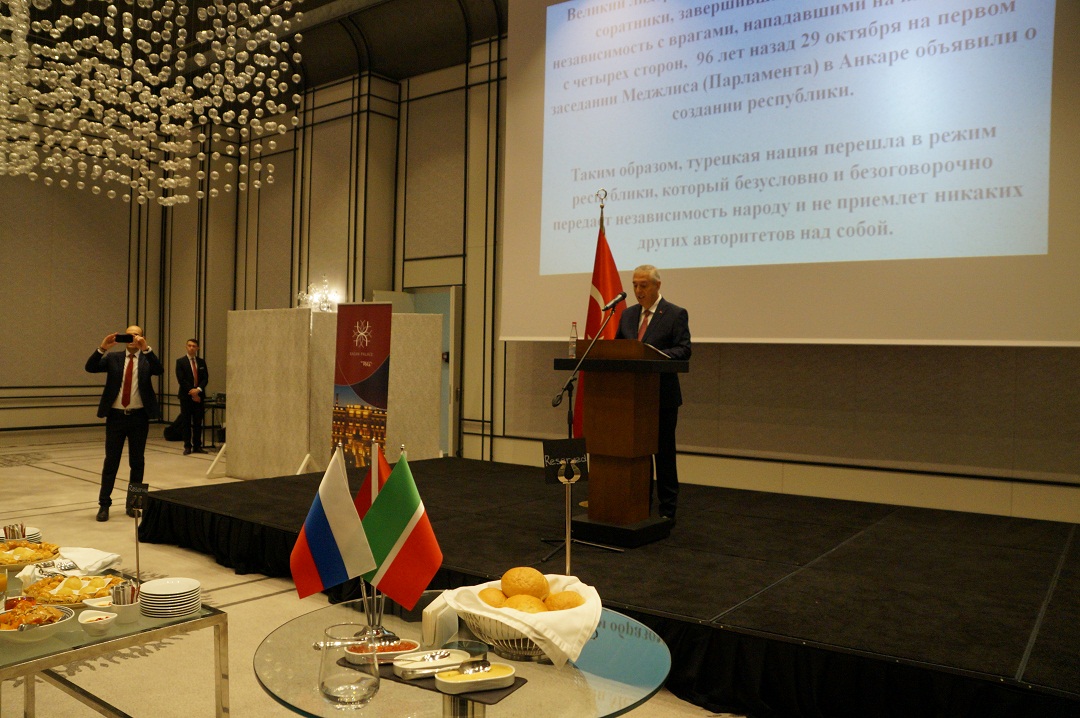 Вчера, в 1-ый день месяца Раби аль-авваль, муфтий Республики Татарстан Камиль хазрат Самигуллин принял участие в официальном приеме Генерального Консула Турции в Казани Исмета Эрикана по случаю 96-ой годовщины Турецкой Республики. Среди гостей вечера были политические, общественные и религиозные деятели, а также предприниматели и представители СМИ. В своей приветственной речи Генконсул Исмет бей отметил: «Мы твердо уверены, что дружба между Турцией и Россией и сотрудничество во всех сферах будут продолжаться. Хотел бы подчеркнуть тот факт, что имеющиеся тесные связи с Республикой Татарстан укрепляют наши отношения с Российской Федерацией».