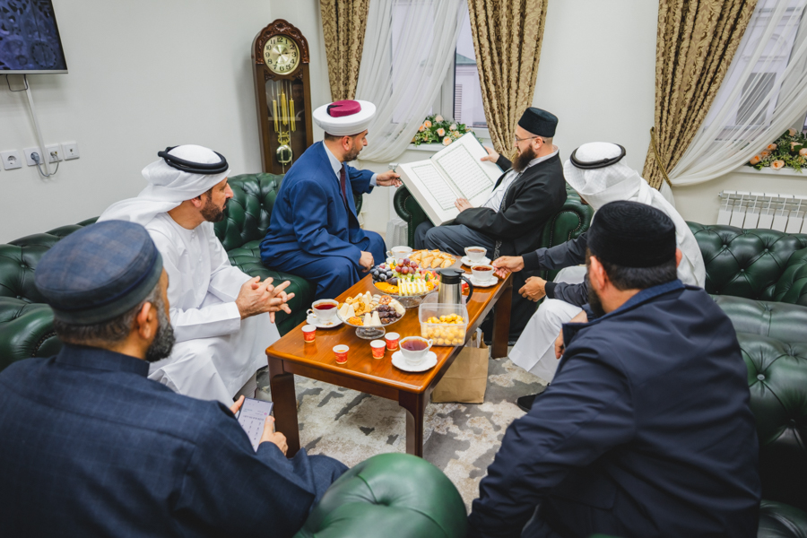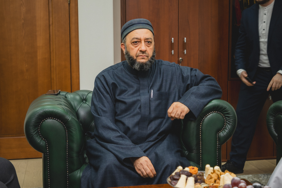 Сегодня, в 1-й день месяца Джумадаль-авваль (23 октября), Муфтий Камиль хазрат Самигуллин встретился с участниками II Всероссийского симпозиума с международным участием «Традиции и инновации в мусульманском образовании России». Среди гостей – член Генерального секретариата Совета по делам религии Ливанской Республики Файз Мустафа Сейф; декан гуманитарного факультета университета короля Халида, профессор, доктор филологических наук, член редколлегии серии учебников по арабскому языку Салех Абдулла аль-Шасри (КСА); профессор Университета гуманитарных наук имени Мухаммада бен Зайеда, доктор исламских наук, экс-министр вакуфов Иордании Мухаммад Нух аль-Куда (ОАЭ), а также преподаватель университета Имама Ашари Абдуррахман Абдурахманов (Республика Дагестан). Во встрече также принял участие всемирно известный богослов, обладатель наивысшей степени по хифзу Куръана (знаток 10 кыраатов), главный судья и председатель жюри в конкурсах по Куръану в странах Персидского залива, потомок пророка Мухаммада ﷺ, член Комиссии по подготовке рукописного Куръана в Казани шейх Маъмун ар-Рави.