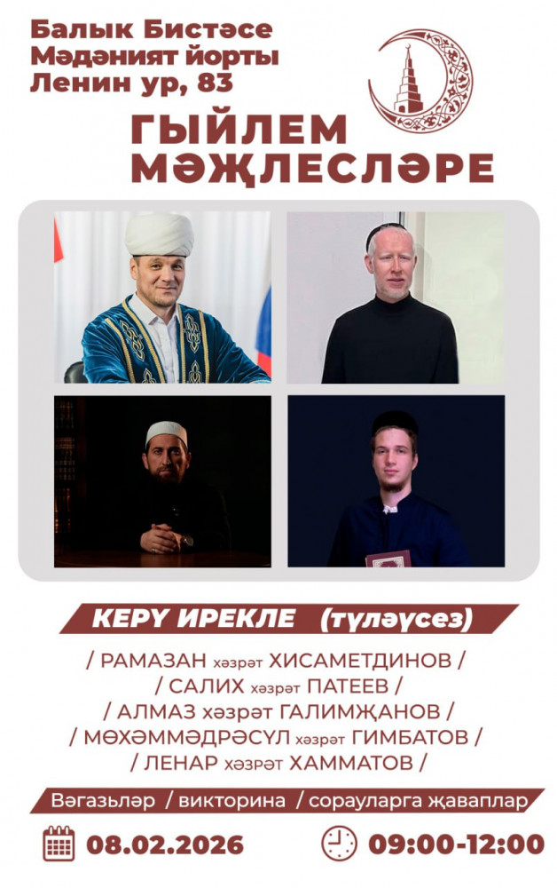 8 февраля (в 20-й день месяца Ша’бан) в Рыбно-Слободском мухтасибате состоится очередная встреча хазратов с населением под названием «Гыйлем мәҗлесләре». Ожидается, что на встречу придут не только жители Рыбно-Слободского района, но и мусульмане из соседних районов: Лаишевского, Пестречинского, Мамадышского, Алексеевского и Чистопольского.